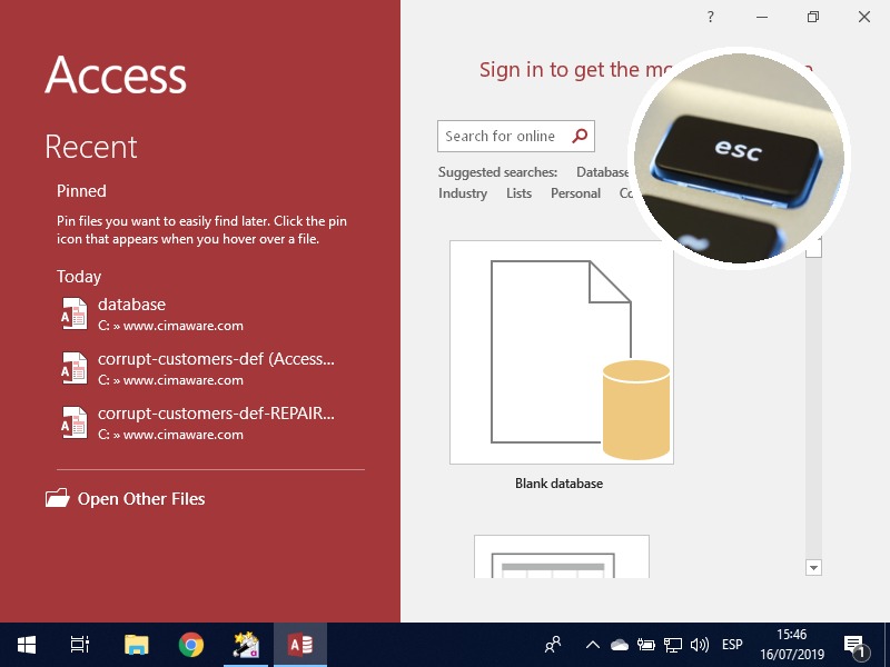 If you have opened Access from the Windows Start menu, you will see the Access initial screen. Press the Esc key to exit this screen and access the menus.