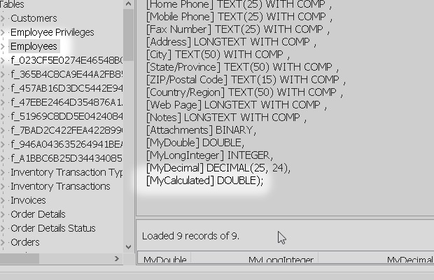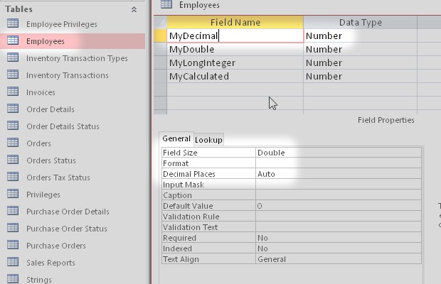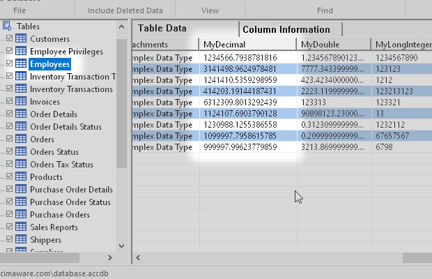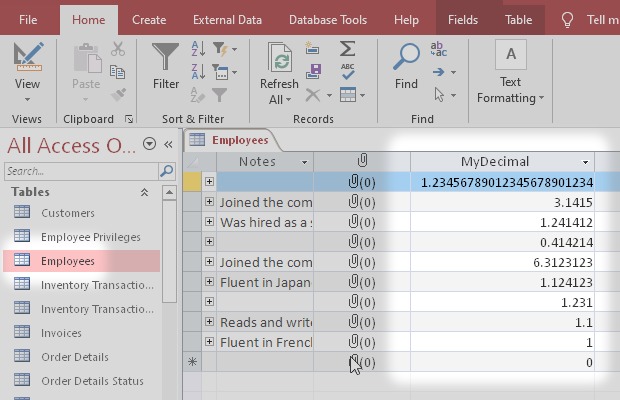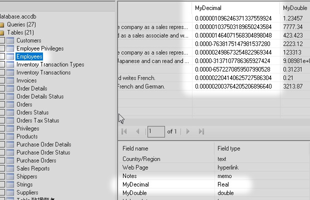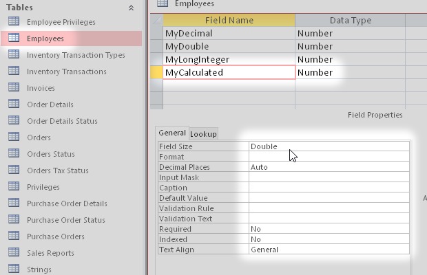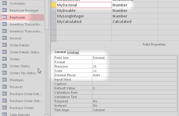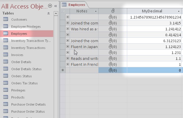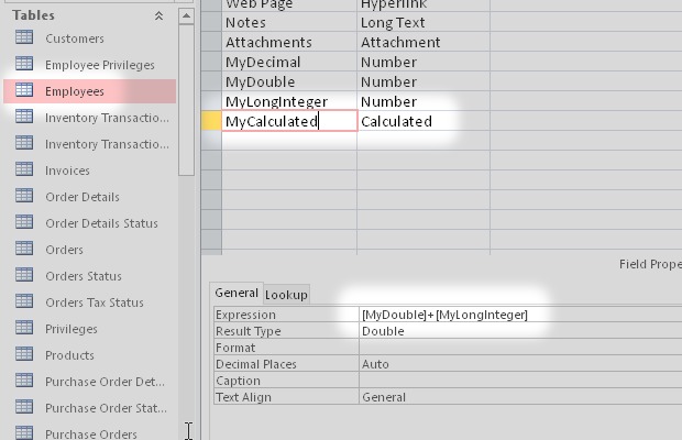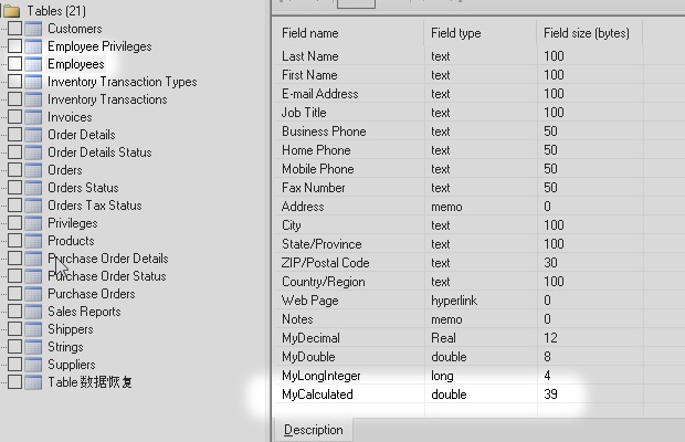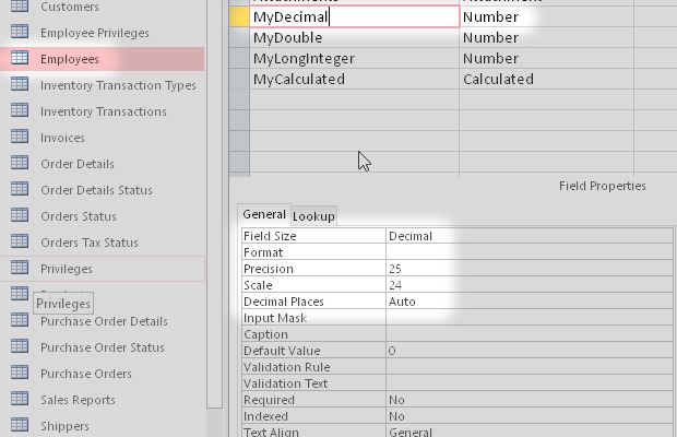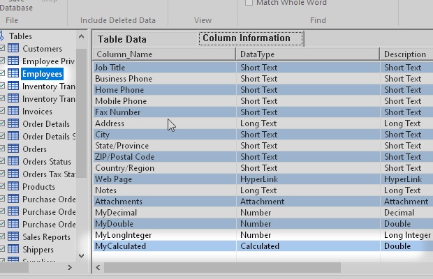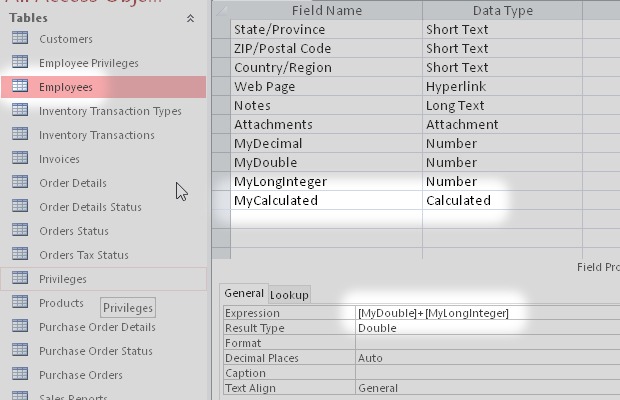 I started from the Microsoft Access sample database Northwind.accdb. Then I added some new types of field like Attachment, Decimal, Calculated and others.