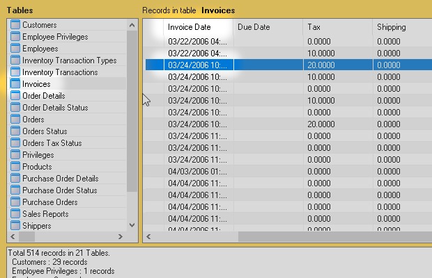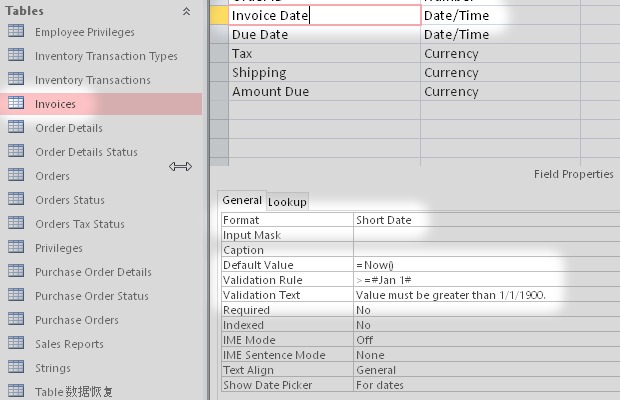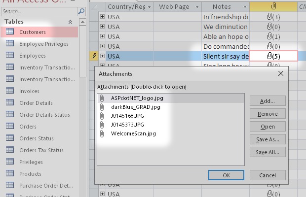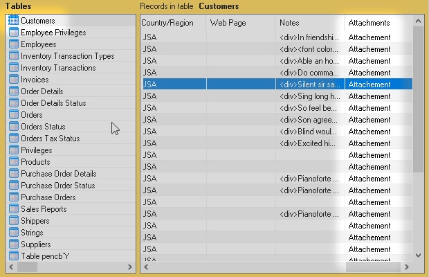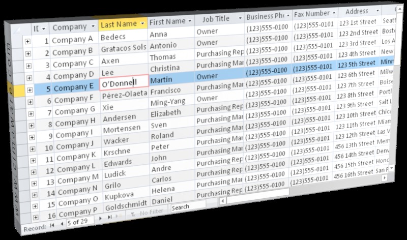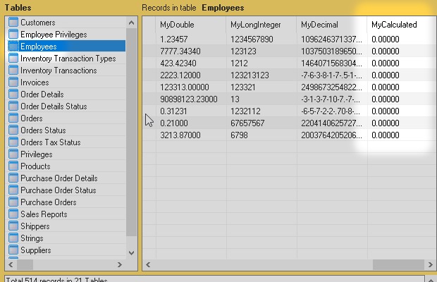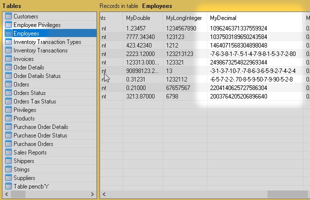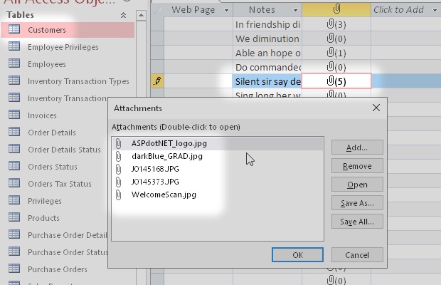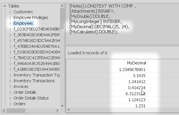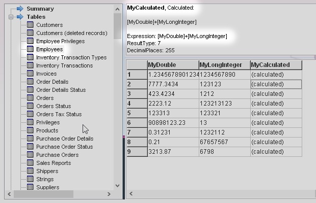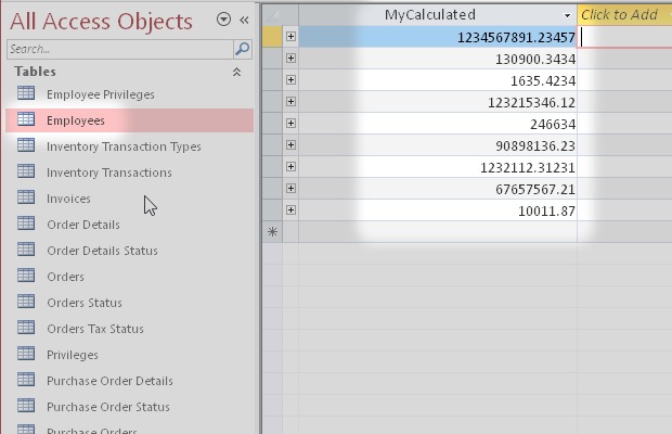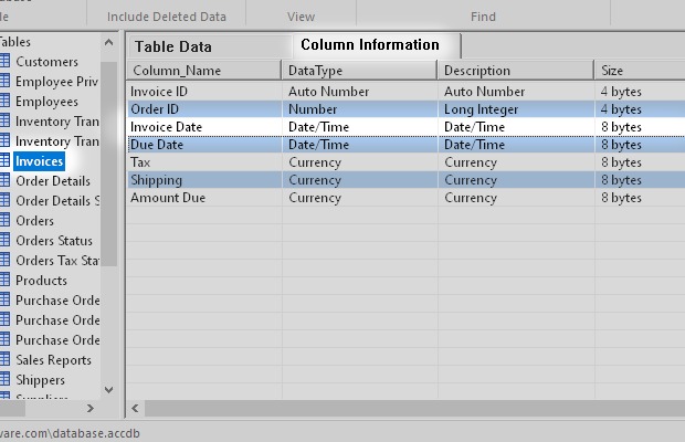 I started from the Microsoft Access sample database Northwind.accdb. Then I added some new types of field like Attachment, Decimal, Calculated and others.