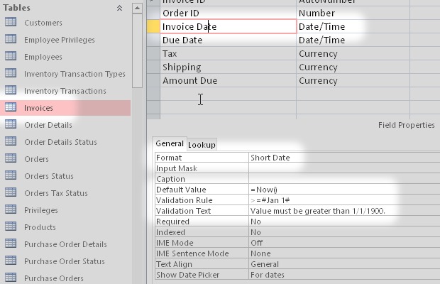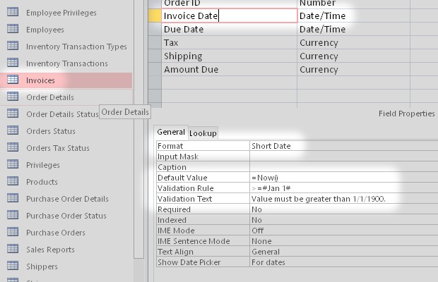 Some field properties: date format, number format, default value, comments, validation rules, etc.