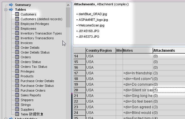 A field of type Attachment may contain one or more files, including their names and data. This type of field is complex and difficult to decode. Let's see how each tool works with them.