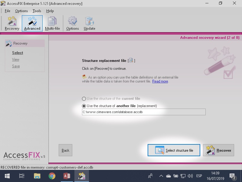 From AccessFIX, activate the Advanced recovery and select the damaged file. Then, in the structure replacement option, we select the old copy. The copy provide the missing definition.