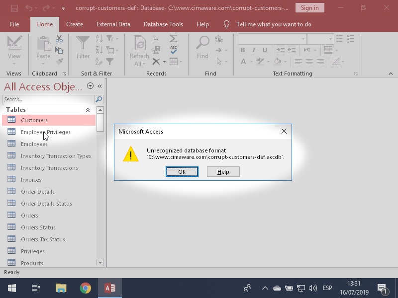 The definition of the Customers table is corrupted. If we try to open the table, we get an error.